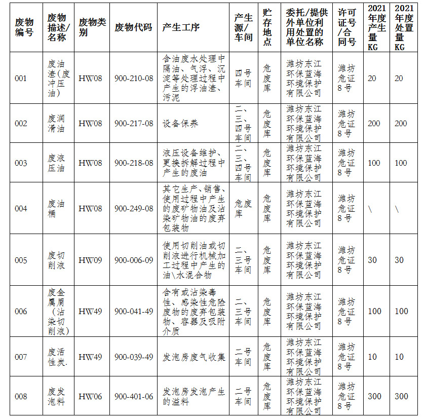 2021年危險廢物產(chǎn)生量為760kg,貯存760kg,處理危險廢物760kg,年底庫存量0kg。其中廢油渣(廢沖壓油)(HW08)20噸、廢潤滑油(HW08)200kg、廢液壓油(HW08)100kg、廢切削液(HW09)30kg、廢金屬屑(沾染切削液)(HW49)100kg、廢活性炭(HW49)10kg、廢發(fā)泡料(HW06)300kg。