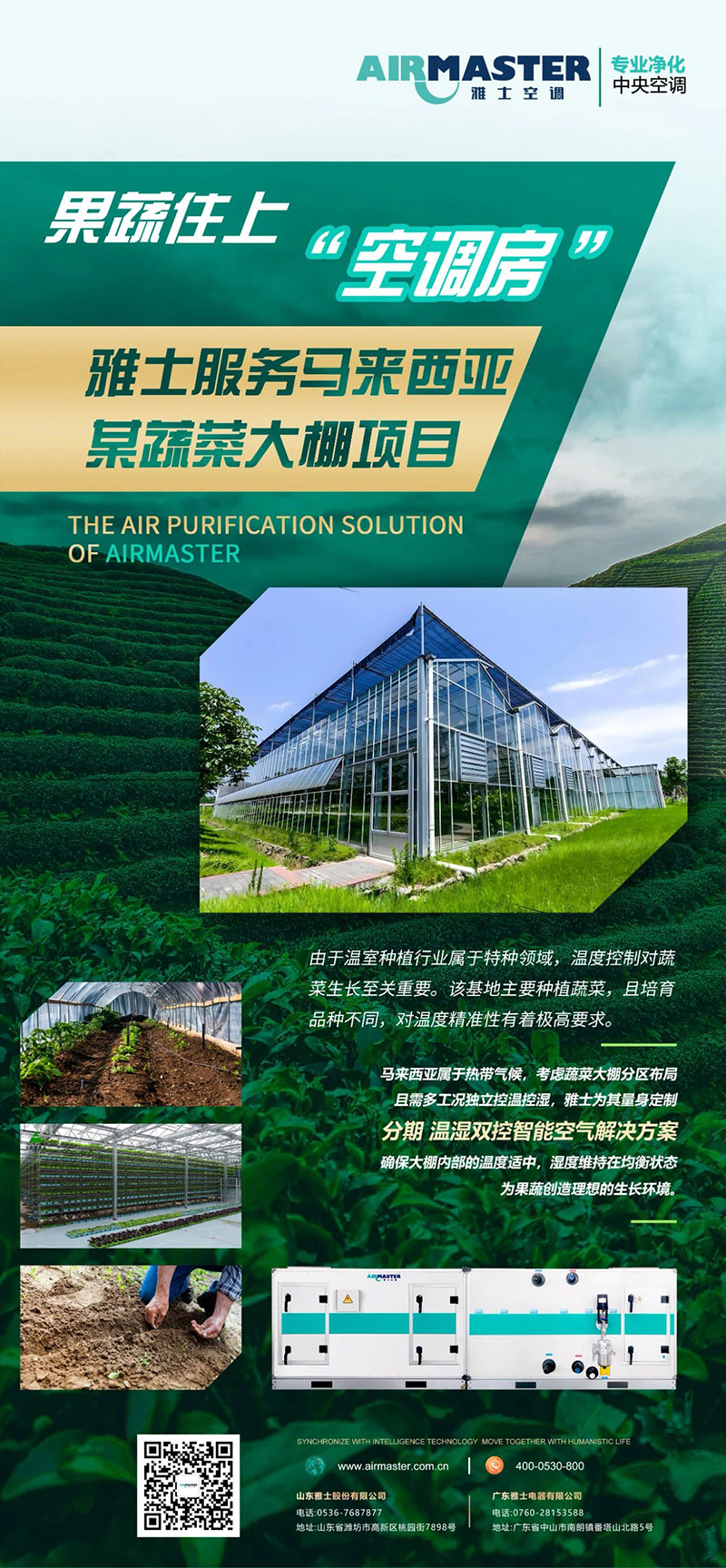 雅士為馬來西亞某蔬菜大棚項目量身定制空氣解決方案,確保大棚內部的溫度適中,濕度維持在均衡狀態,創造理想的生長環境。