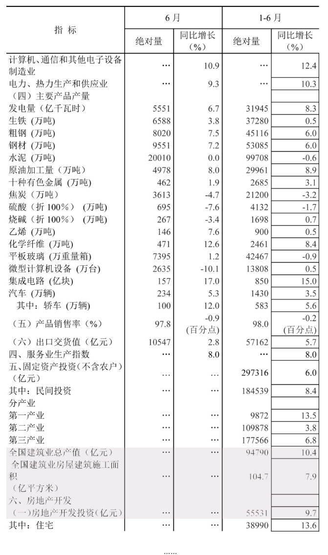 第三產(chǎn)業(yè)中,基礎(chǔ)設(shè)施投資(不含電力、熱力、燃?xì)饧八a(chǎn)和供應(yīng)業(yè))同比增長(zhǎng)7.3%,增速比1-5月份回落2.1個(gè)百分點(diǎn)。其中,水利管理業(yè)投資增長(zhǎng)0.4%,增速回落3.5個(gè)百分點(diǎn);公共設(shè)施管理業(yè)投資增長(zhǎng)5.8%,增速回落2.8個(gè)百分點(diǎn);道路運(yùn)輸業(yè)投資增長(zhǎng)10.9%,增速回落3.9個(gè)百分點(diǎn);鐵路運(yùn)輸業(yè)投資下降10.3%,降幅收窄1.1個(gè)百分點(diǎn)。